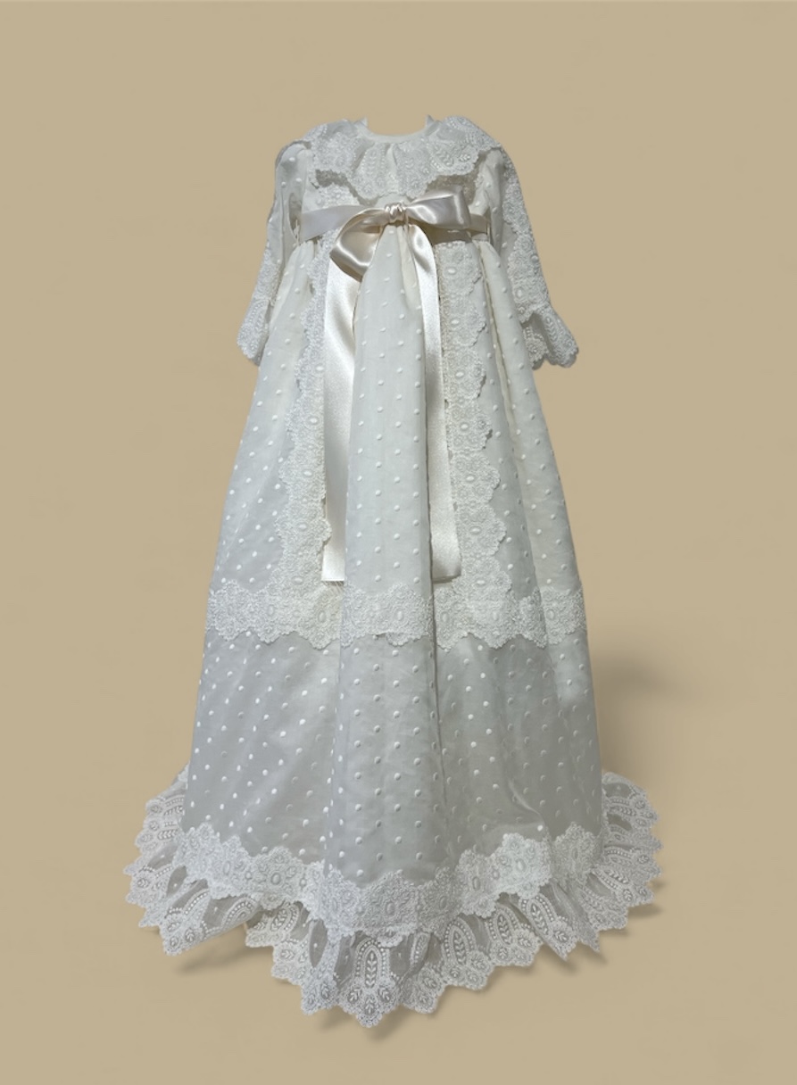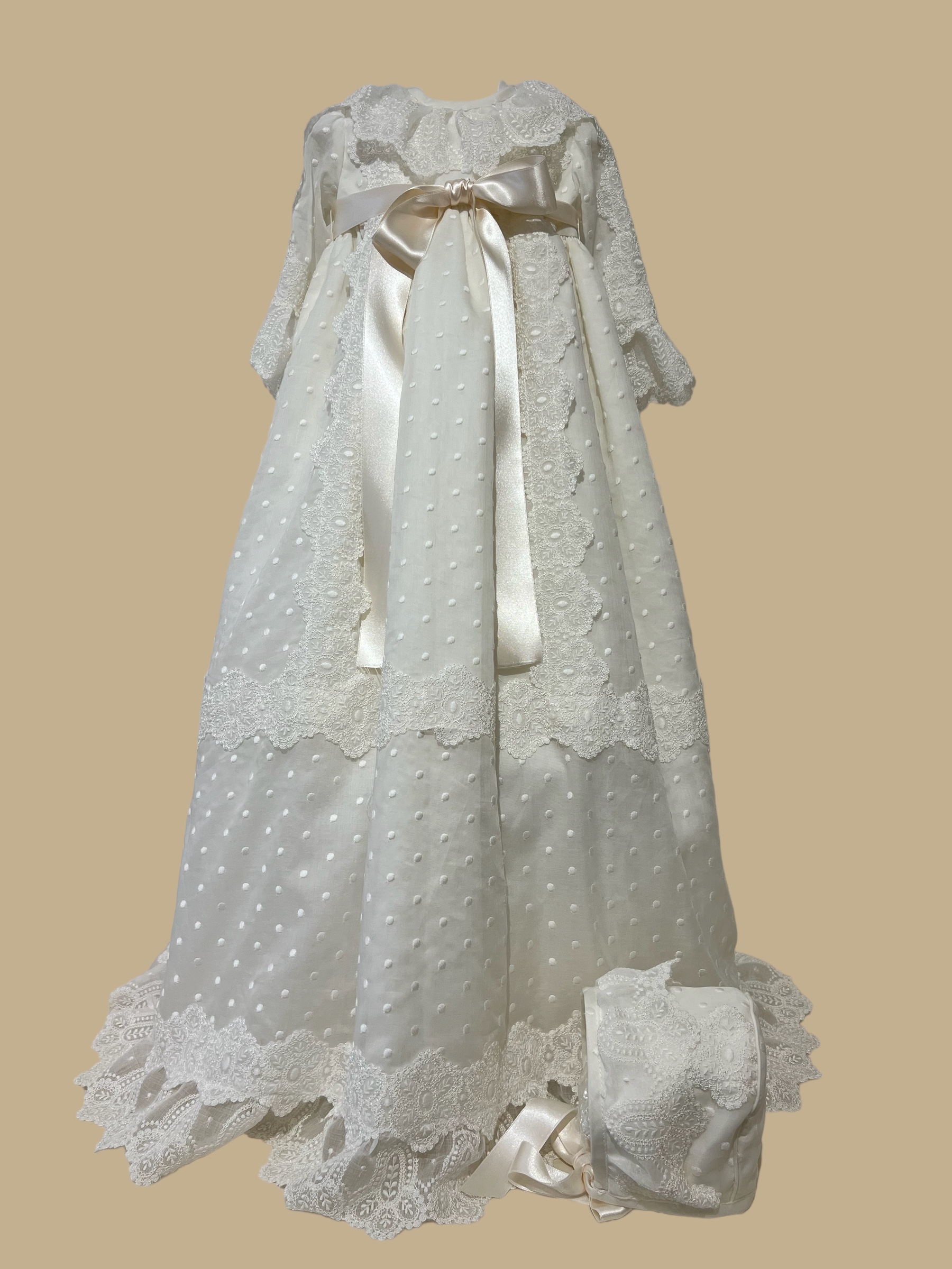 Faldón con braguita y capota en tejido de organdil italiano bordado. +info: 674 884 014