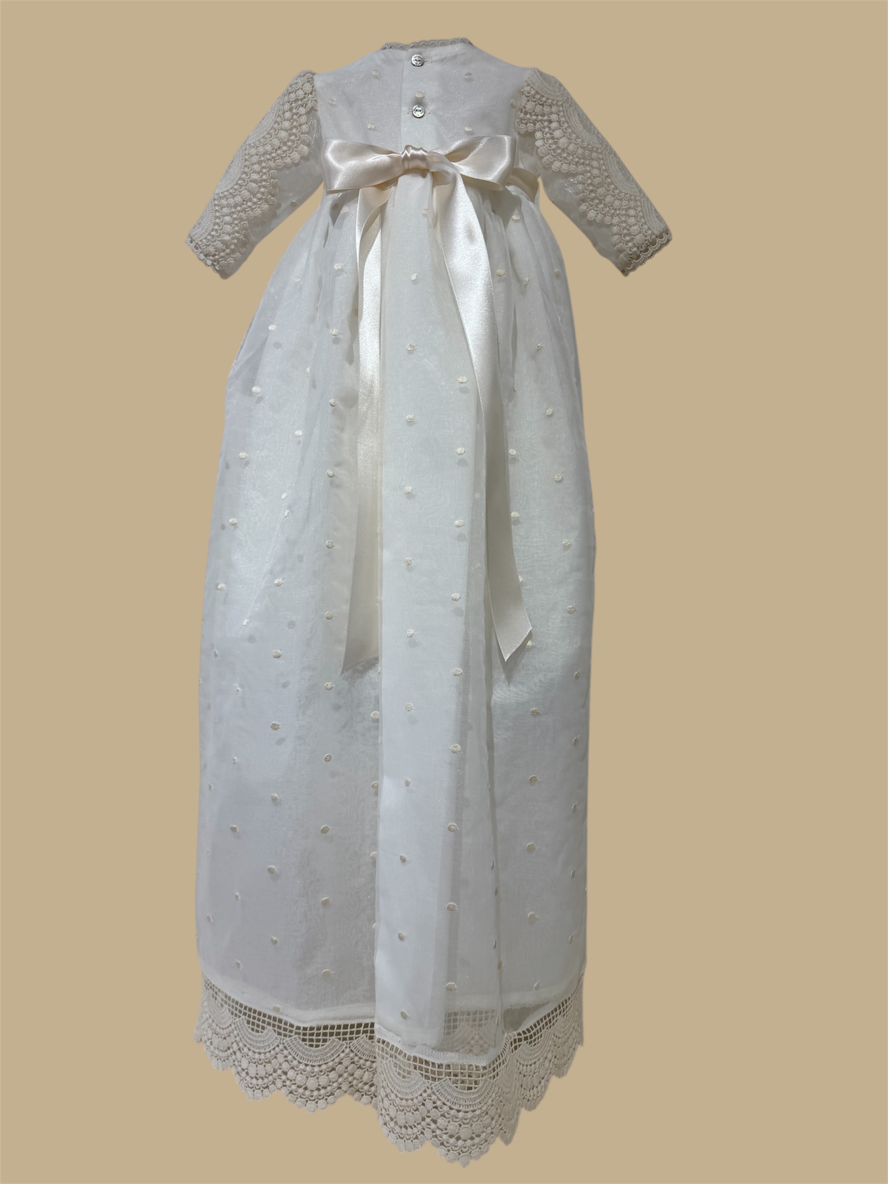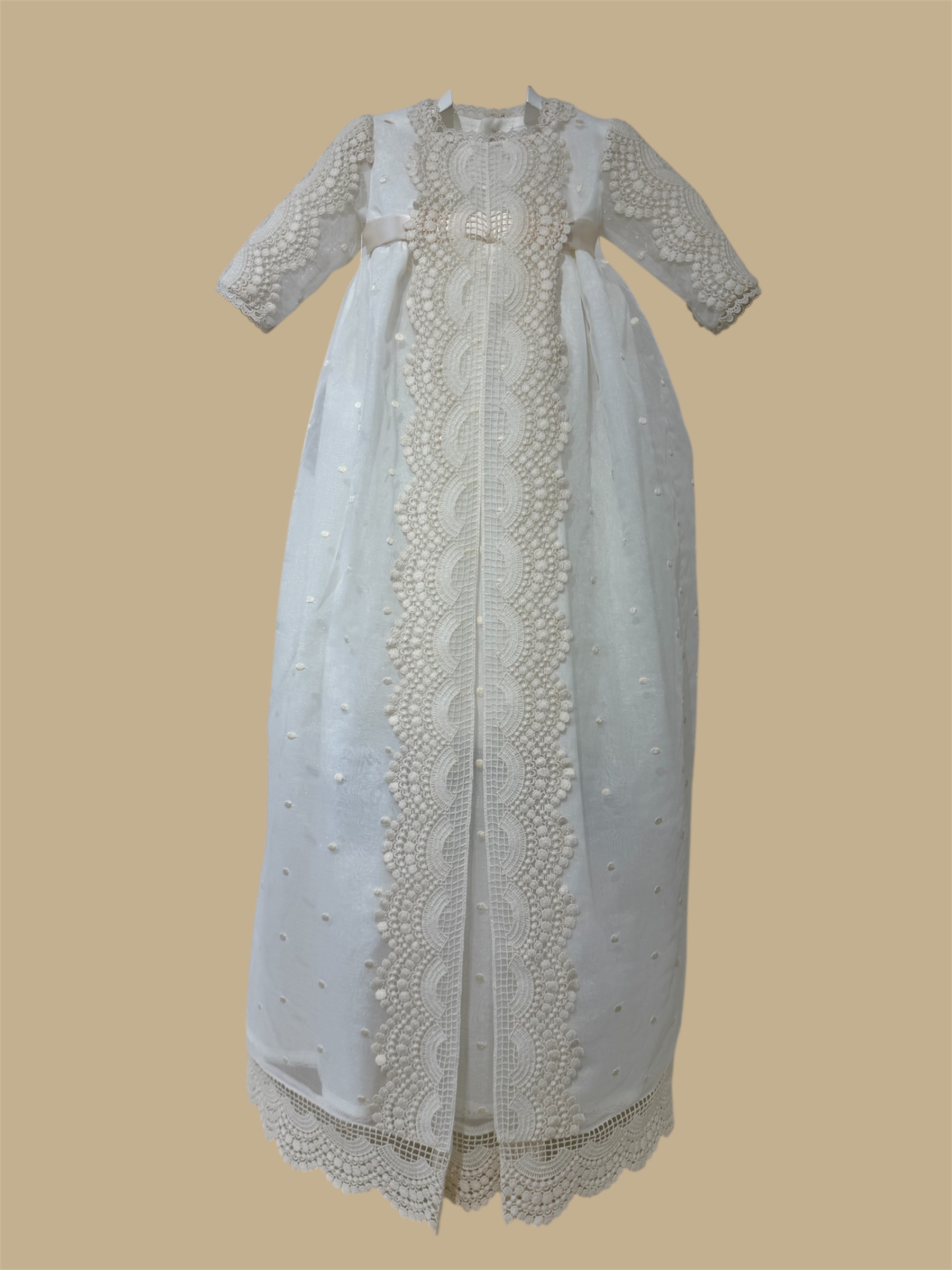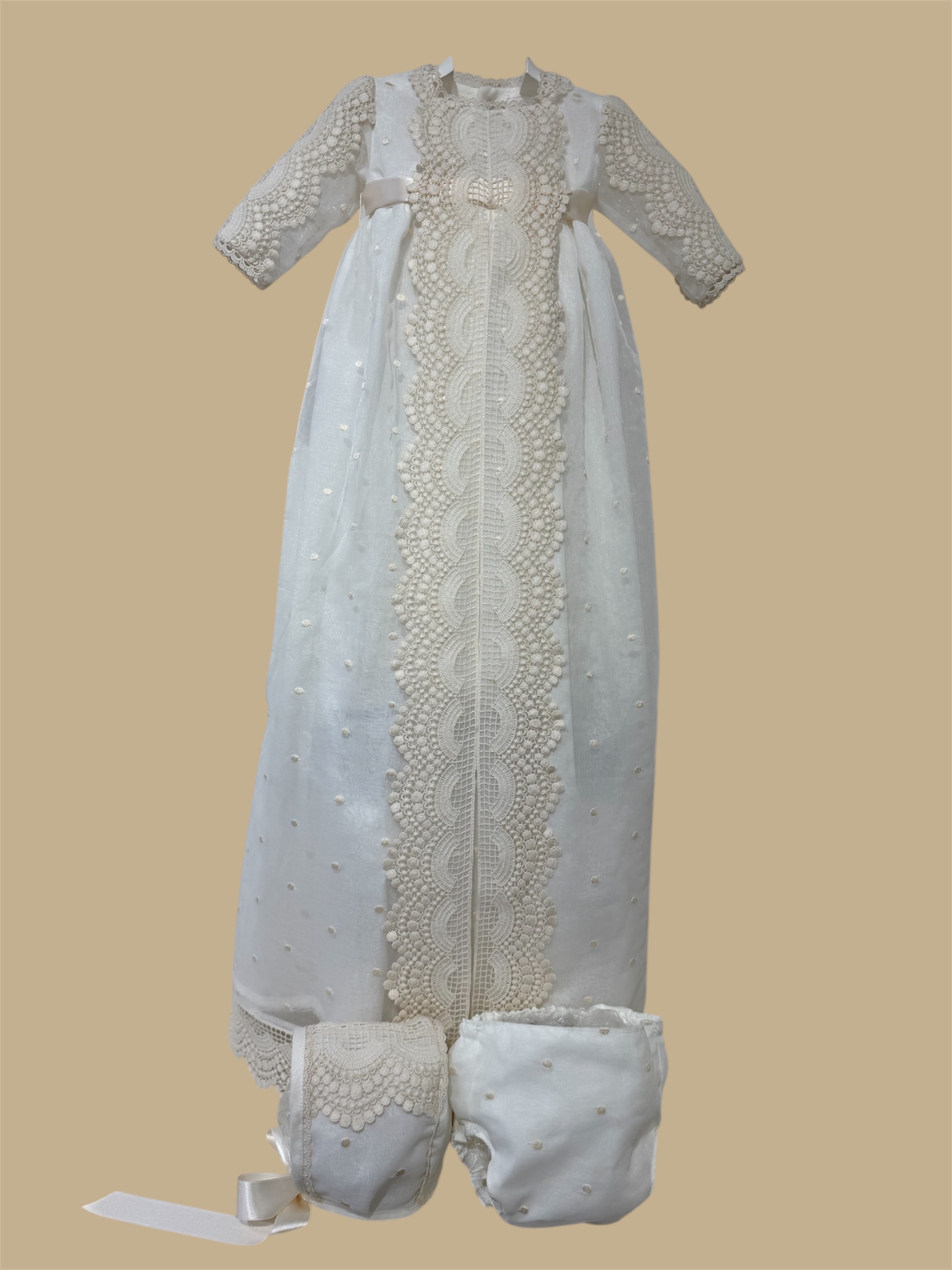Faldón con braguita y capota en tejido de organza bordada. +info: 674 884 014