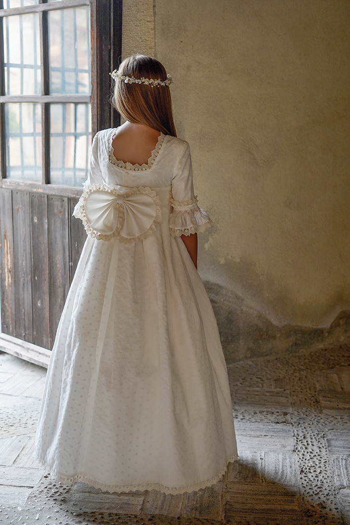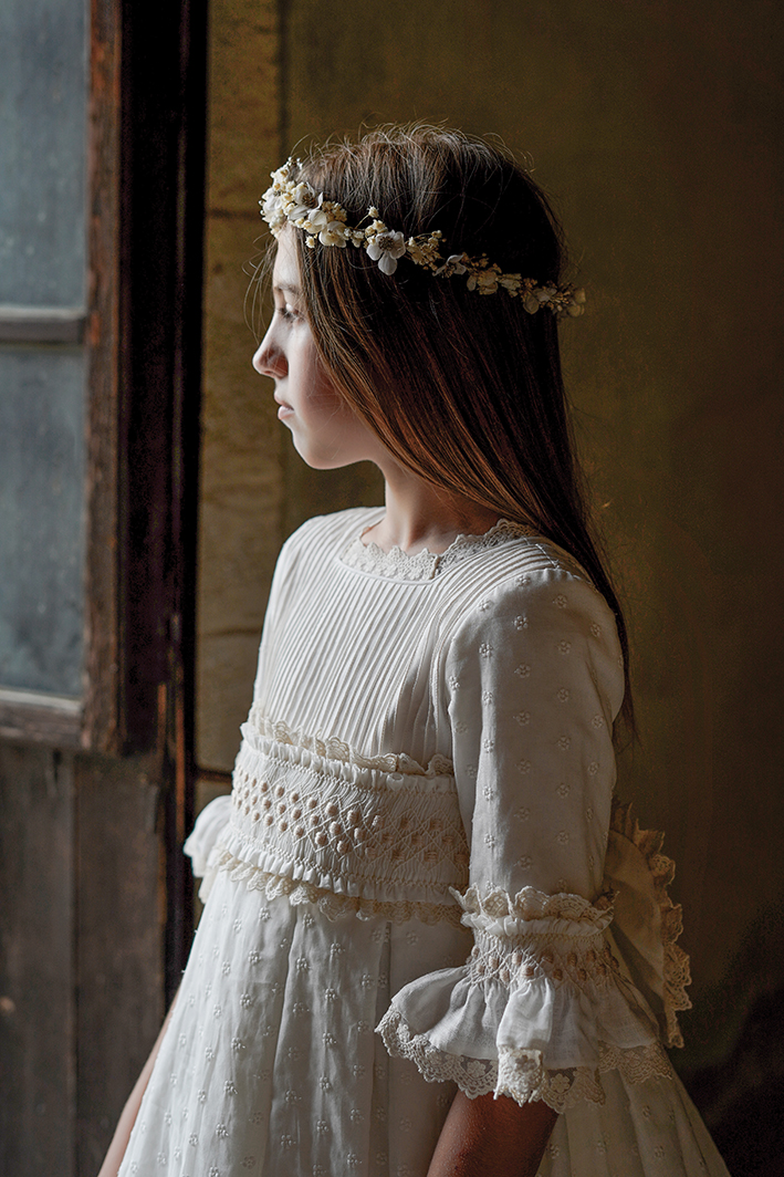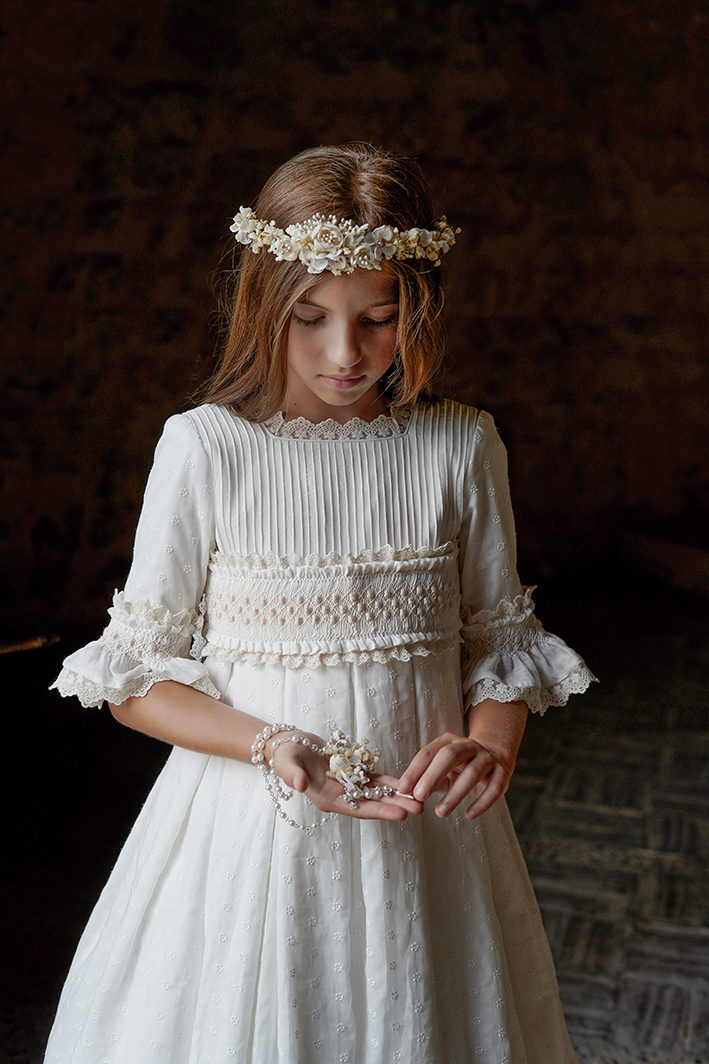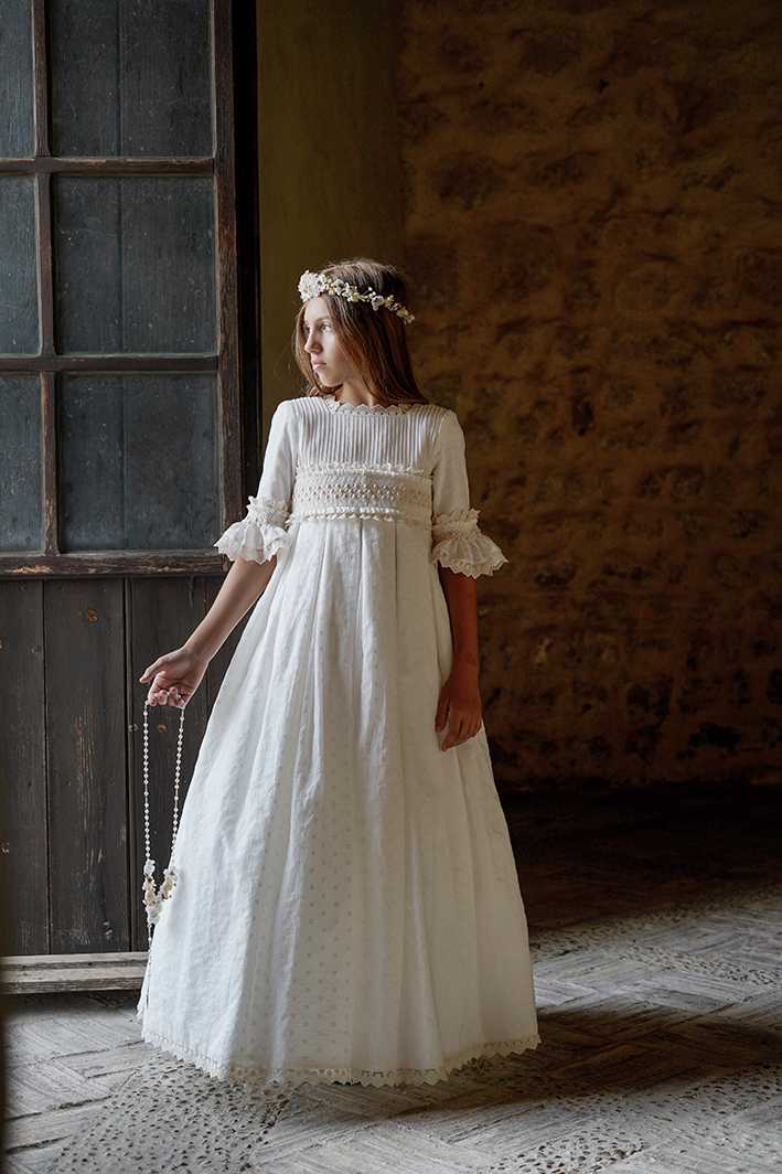 Vestido de comunión de muselina bordada francesa, bordado punto smock a mano