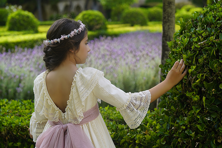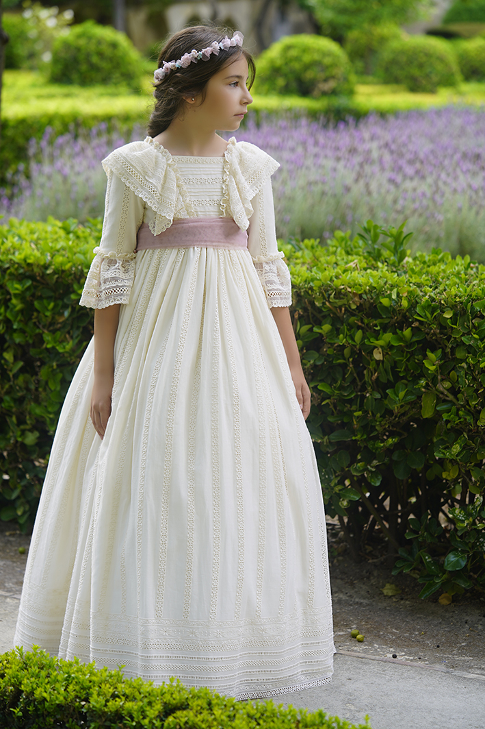 Vestido de comunión de muselina bordada con encajes de tul bordados