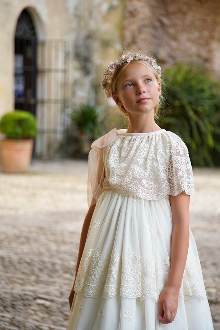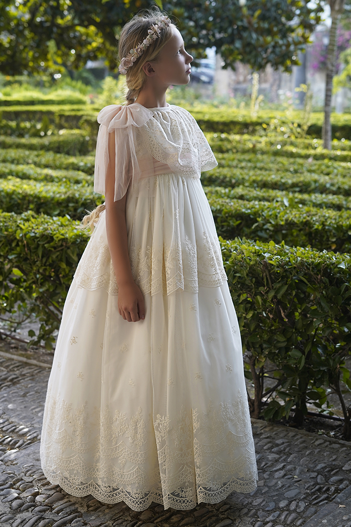 vestido de comunión con capa de tul bordado