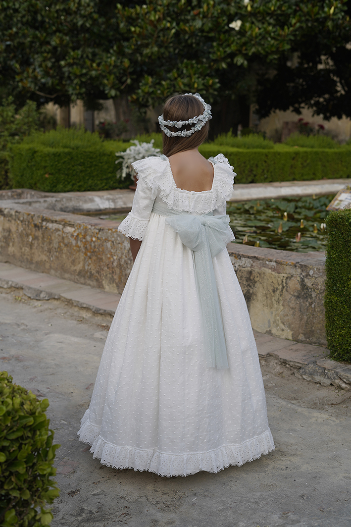 Vestido de comunión de lino bordado con encajes franceses